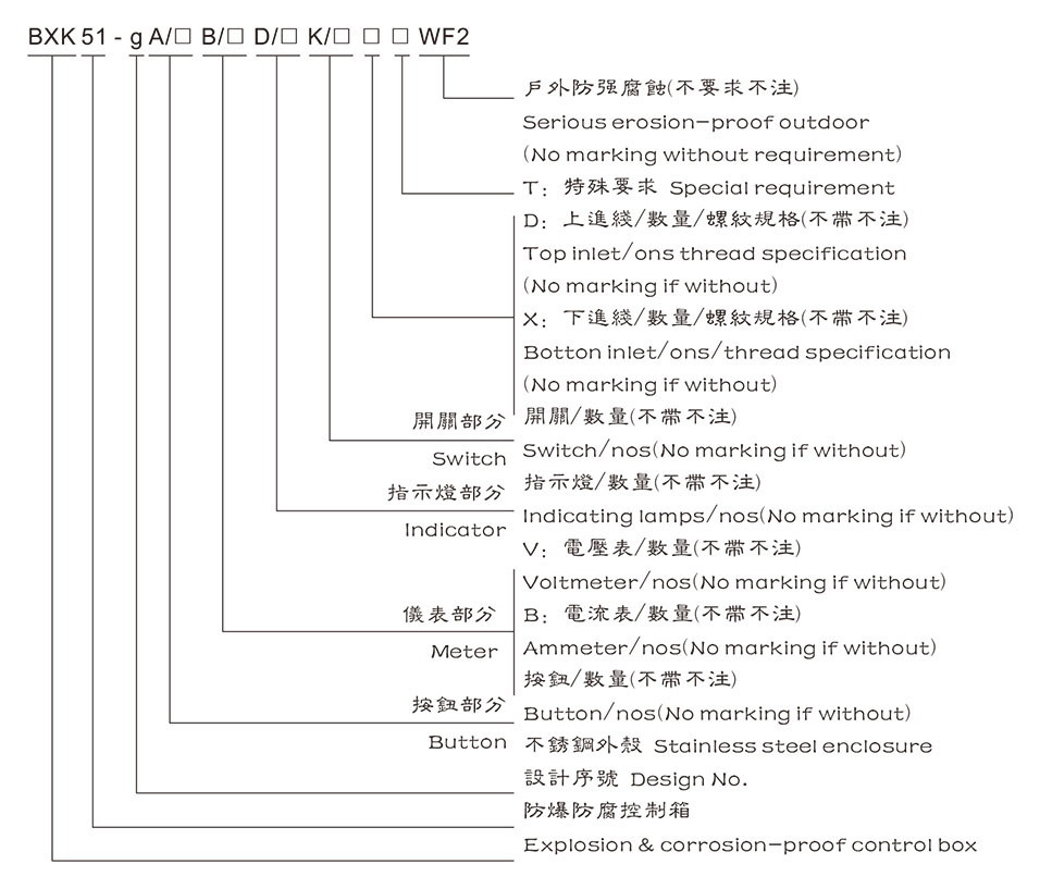 1. 按照型號含義中的規則逐條進行選擇,并在型號含義后增加防爆標志。